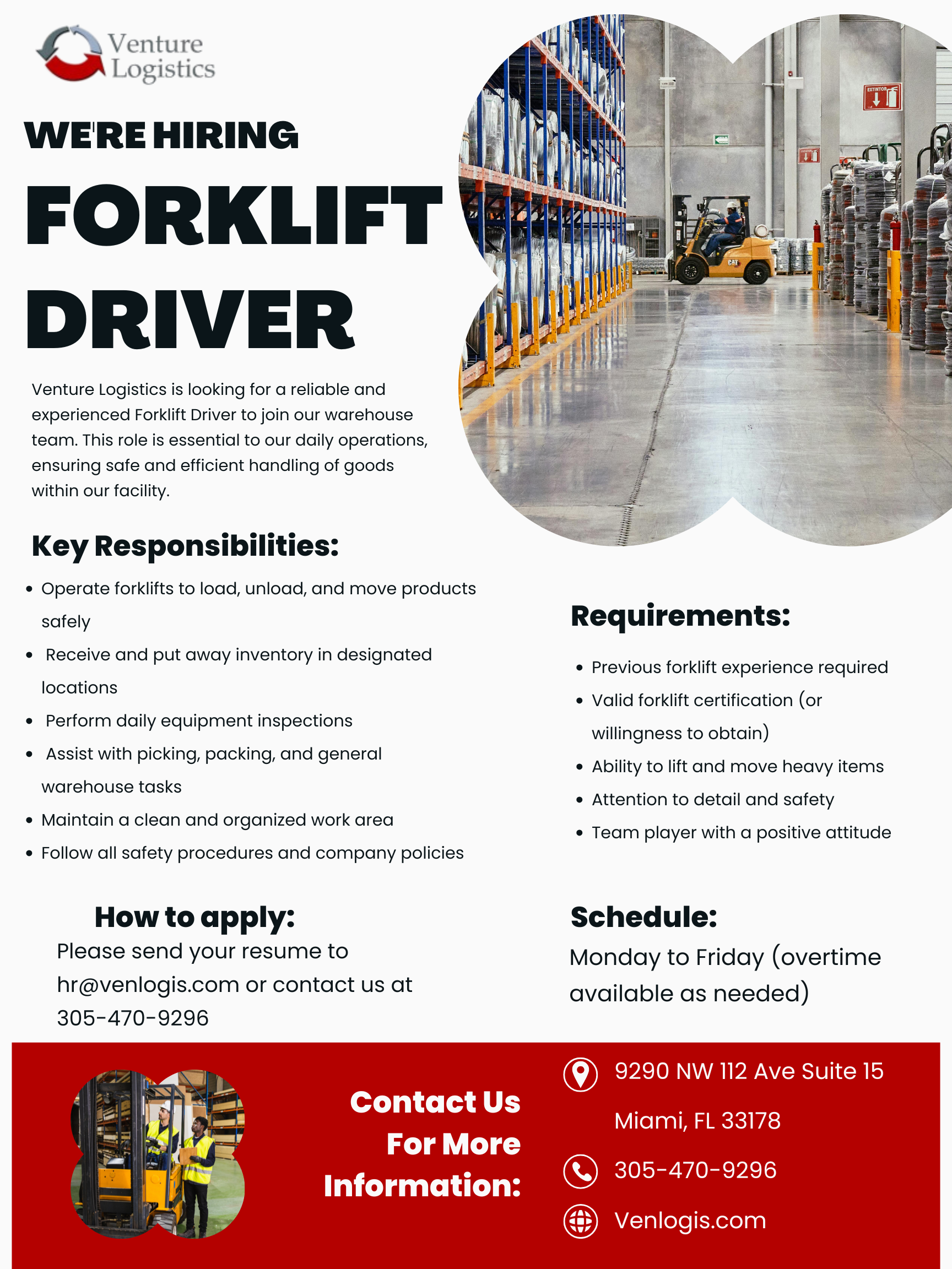 Join a growing logistics team in Miami, Florida, where reliability meets opportunity. At Venture Logistics, we’re looking for motivated individuals ready to move their careers forward in a fast-paced, supportive environment.